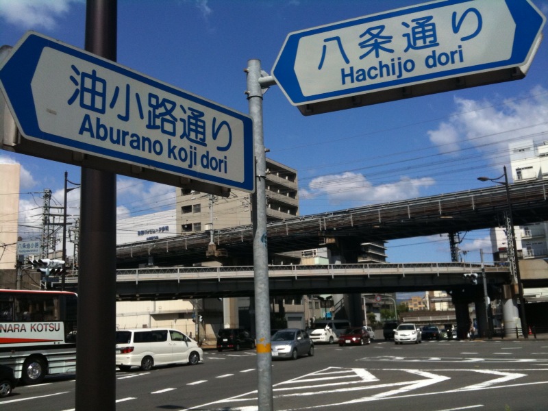 堀川から油小路へ 堀川通は京都駅から南に下がると、油小路通と名を変えます。私の家は油 小路に面しているのですが、名の通り細い小路です。それが南に行くと一 転大通りに変身。 油小路と聴いて、小路、または大通りを連想するかは。地域差が出ます。 看板に「油小路通り」と記してありますが、京都の道には正式には「油小 路通」と送り仮名を付けません。国交省の大臣が前原さんになったので、 変わるかな。